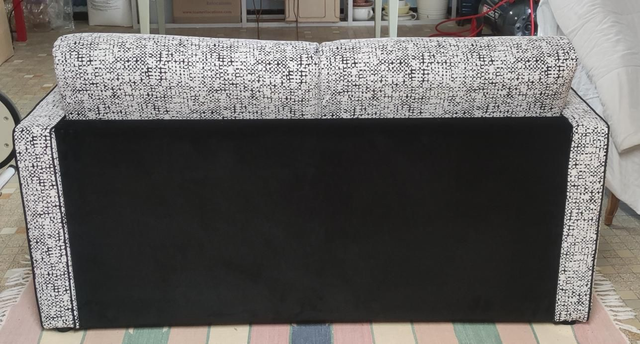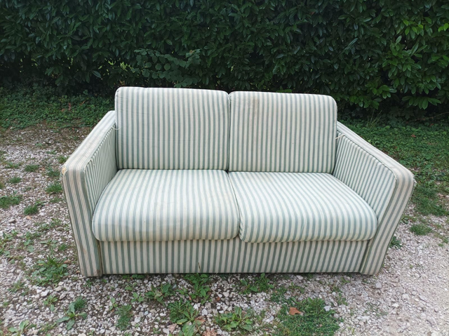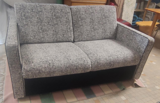 Assorti au fauteuil ce canapé dans un piteux état qui a lui aussi retrouvé une seconde jeunesse !