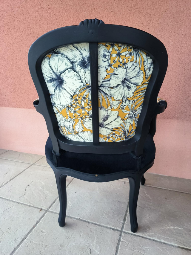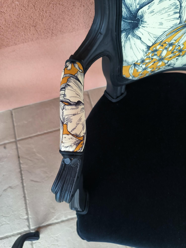 Recouvert de velours ras noir pour l'assise et coloré pour le dossier et les accoudoirs.