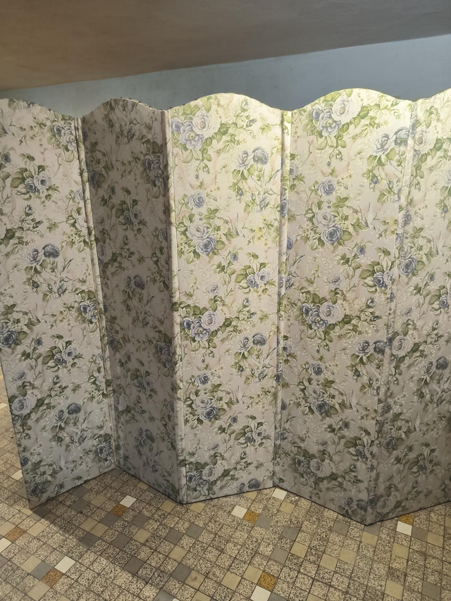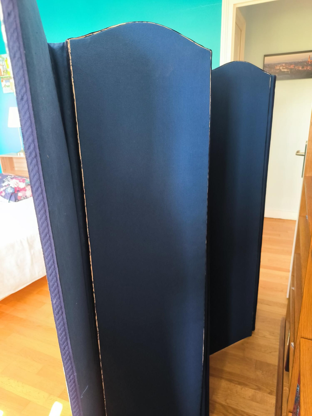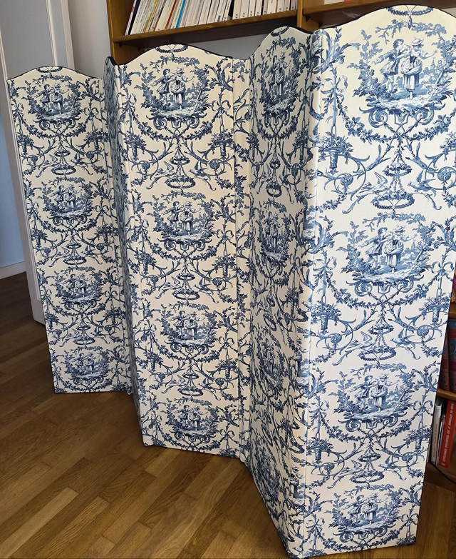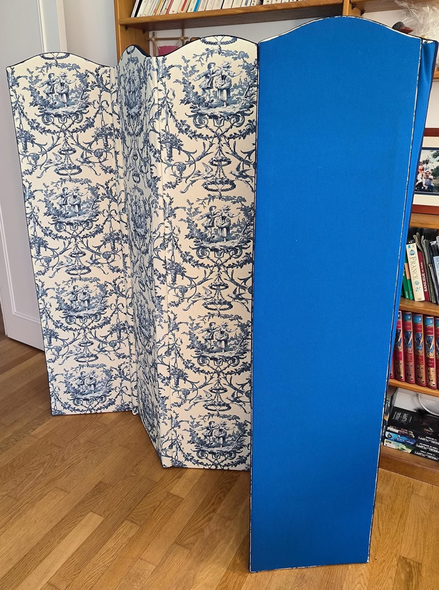 Magnifique paravent refait à l'ancienne : protection en papier sous le tissu, charnières invisibles.