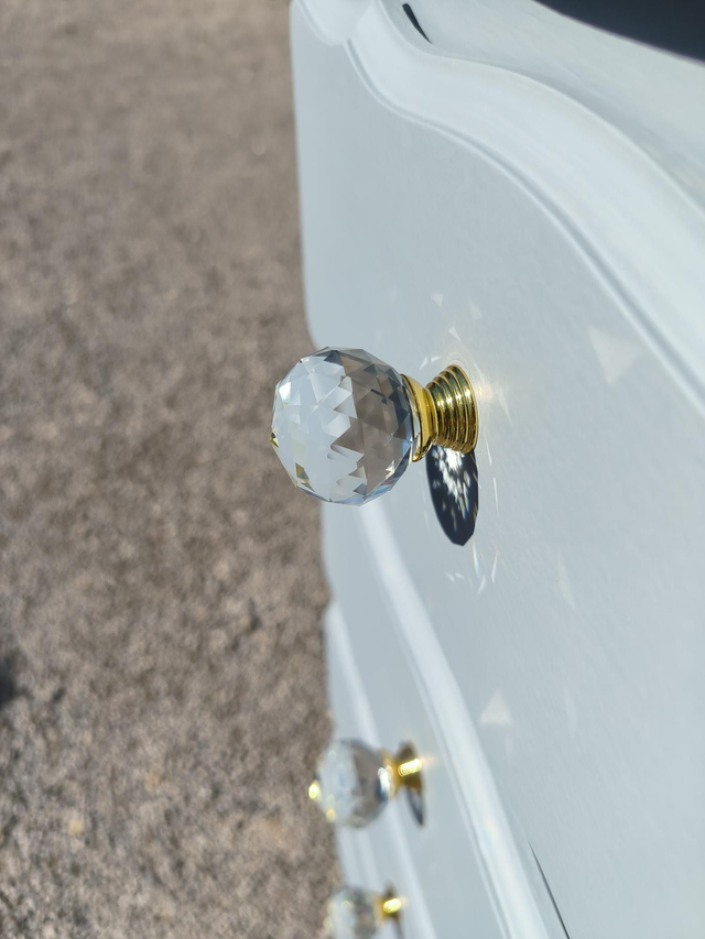 Tout son chic vient des boutons de tiroir que j'ai changé pour ces jolies boules de verre et laiton.
